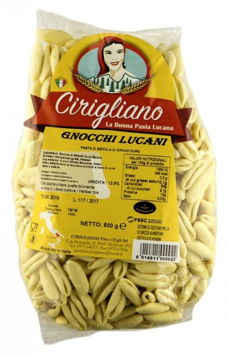 - I nostri Gnocchetti Lucani, sono fatti con cura artigianale dal pastificio CIRIGLIANO che utilizza solo ingredienti semplici e genuini secondo la tradizione, proprio come quelle che facevano a mano le nostre nonne.