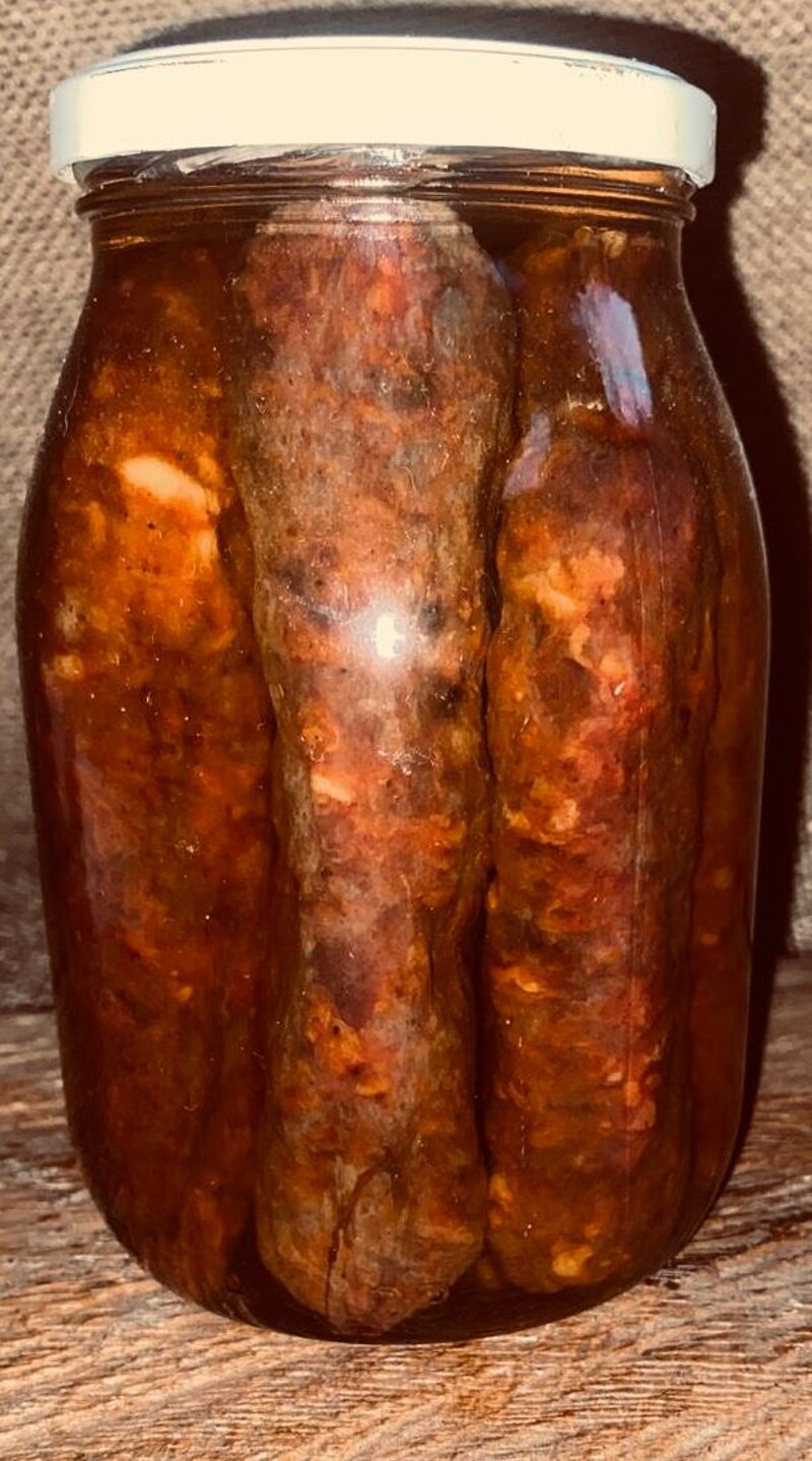 - Il prodotto viene venduto in un vasetto da 1.5 kg, di cui 700g circa di salsiccia di maiale e il resto olio d'oliva;